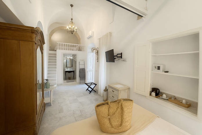 Son sol en marbre noble, ses impressionnantes hauteurs sous plafond et ses magnifiques voûtes confèrent à la chambre une atmosphère à la fois majestueuse et chaleureuse. Un équilibre parfait entre élégance tunisienne et confort moderne, pour un séjour à la fois authentique et raffiné.